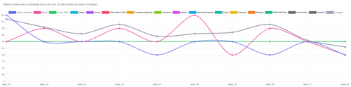 In this table, we benchmark how many emails brands have send and their average email scores, which we calculate using over 50 datapoints that measure how much best practices are ensured (spam score, email authenticiation & certificates, email size, subject line lenght, word & links count etc.)