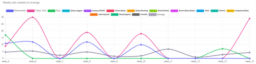 In April, buybuy topped the chart with the highest number of emails sent, totaling 56 emails, followed by Tubby Todd with 27 emails. In terms of new ads launched, Happiest Baby took the lead with 56 new ads, having the highest number of unique ad copies used in its new ads with 38 ad copies in total. Tubby Todd followed with 29 new ads launched during this period.