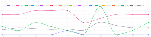 In this table, we benchmark how many emails brands have send and their average email scores, which we calculate using over 50 datapoints that measure how much best practices are ensured (spam score, email authenticiation & certificates, email size, subject line lenght, word & links count etc.)