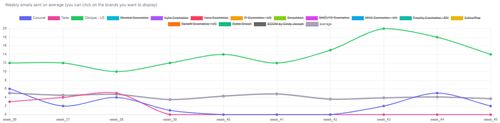 In this table, we benchmark how many emails brands have send and their average email scores, which we calculate using over 50 datapoints that measure how much best practices are ensured (spam score, email authenticiation & certificates, email size, subject line lenght, word & links count etc.)