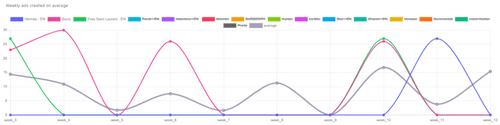 During March, Aurate was the brand with the highest number of emails sent, reaching a total of 21 emails, followed by Summersalt with 19 emails. On the other hand, Prada, Dior, and Moncler stand out for the highest number of new ads launched, reaching a total of 60 new ads for each brand. Moncler leads the pack with 48 unique ad copies during the same period. In terms of media strategy, all the three brands have a preference for using images in their ads, with Dior using the highest number of new images with 38 compared to 19 videos.