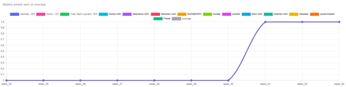 In this table, we benchmark how many emails brands have send and their average email scores, which we calculate using over 50 datapoints that measure how much best practices are ensured (spam score, email authenticiation & certificates, email size, subject line lenght, word & links count etc.)
