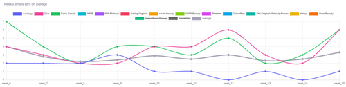 In this table, we benchmark how many emails brands have send and their average email scores, which we calculate using over 50 datapoints that measure how much best practices are ensured (spam score, email authenticiation & certificates, email size, subject line lenght, word & links count etc.)